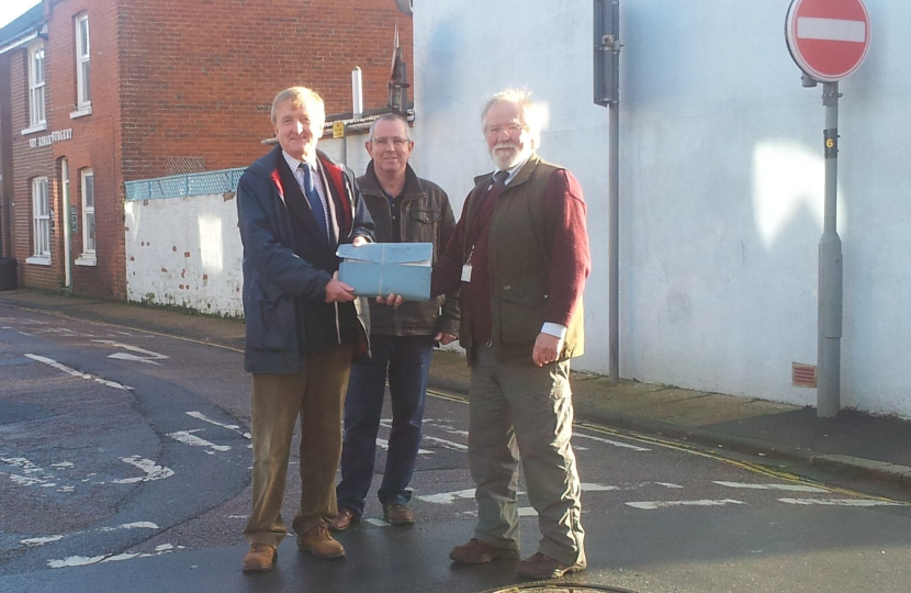 Cllr Edward Giles, Cabinet Member for Highways & Transport, receiving the petition from Cllr John Hobart and Chris Whitehouse.